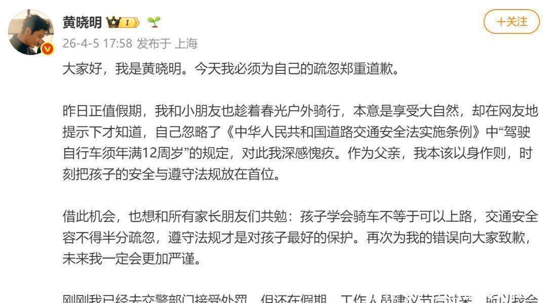 次日,黄晓明在微博上发表了一则致歉声明:大家好,我是黄晓明。今天,我必须为自己的疏忽郑重道歉。昨日正值假期,我与孩子一同趁着春日的阳光,享受户外骑行,本意只是想感受大自然的美好。然而,在网友的提醒下,我才意识到自己忽略了《中华人民共和国道路交通安全法实施条例》中明确规定:驾驶自行车必须年满12周岁。我对此深感愧疚。作为父亲,我本应以身作则,把孩子的安全放在首位,严格遵守法律。借此机会,也希望与所有家长共勉:孩子会骑车并不意味着可以随意上路,交通安全容不得一丝马虎,遵守法规才是对孩子最实在的保护。再次为我的错误向大家致歉,未来我一定会更加谨慎和严谨。刚刚我已去交警部门接受初步处理,但因仍在假期,工作人员建议我节后再来,因此我将在上班时间前往相关部门完成正式处罚和接受批评教育。衷心感谢大家的监督和提醒。